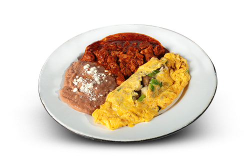Omelette with ham or bacon, mushrooms, pepper, onion and cheese. Served with beans and chilaquiles.