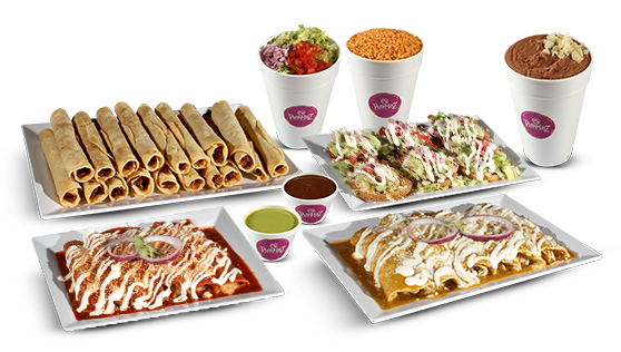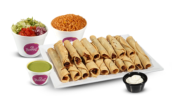 10 flautas, 8 mini flautas (chicken or beef), 16 oz of rice or beans,16 oz of salad and 6 oz of any sauce (to choose)