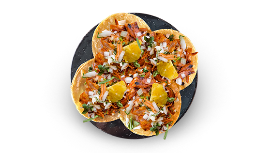4 tacos served with onion, cilantro, pineapple and sauce.